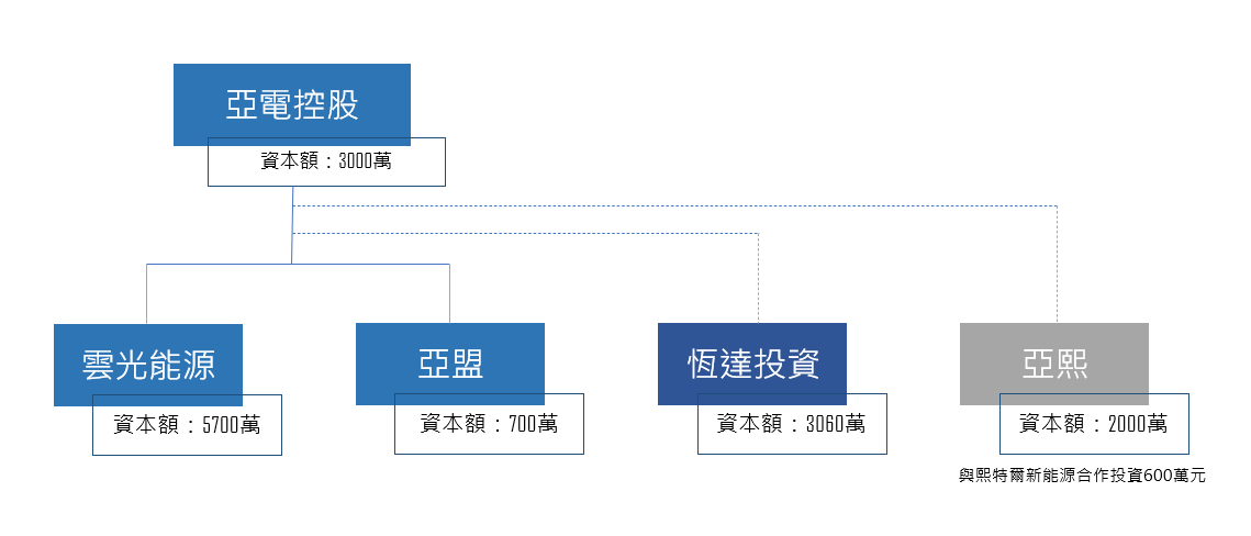 依企業發展策略,亞電控股下設雲光、亞盟兩家子公司,並控管關係企業恆達投資顧問公司,四家公司合計資本額共1億2,460萬元。2022年與策略夥伴熙特爾新能源合作成立亞熙新能源,投入資本額600萬元。