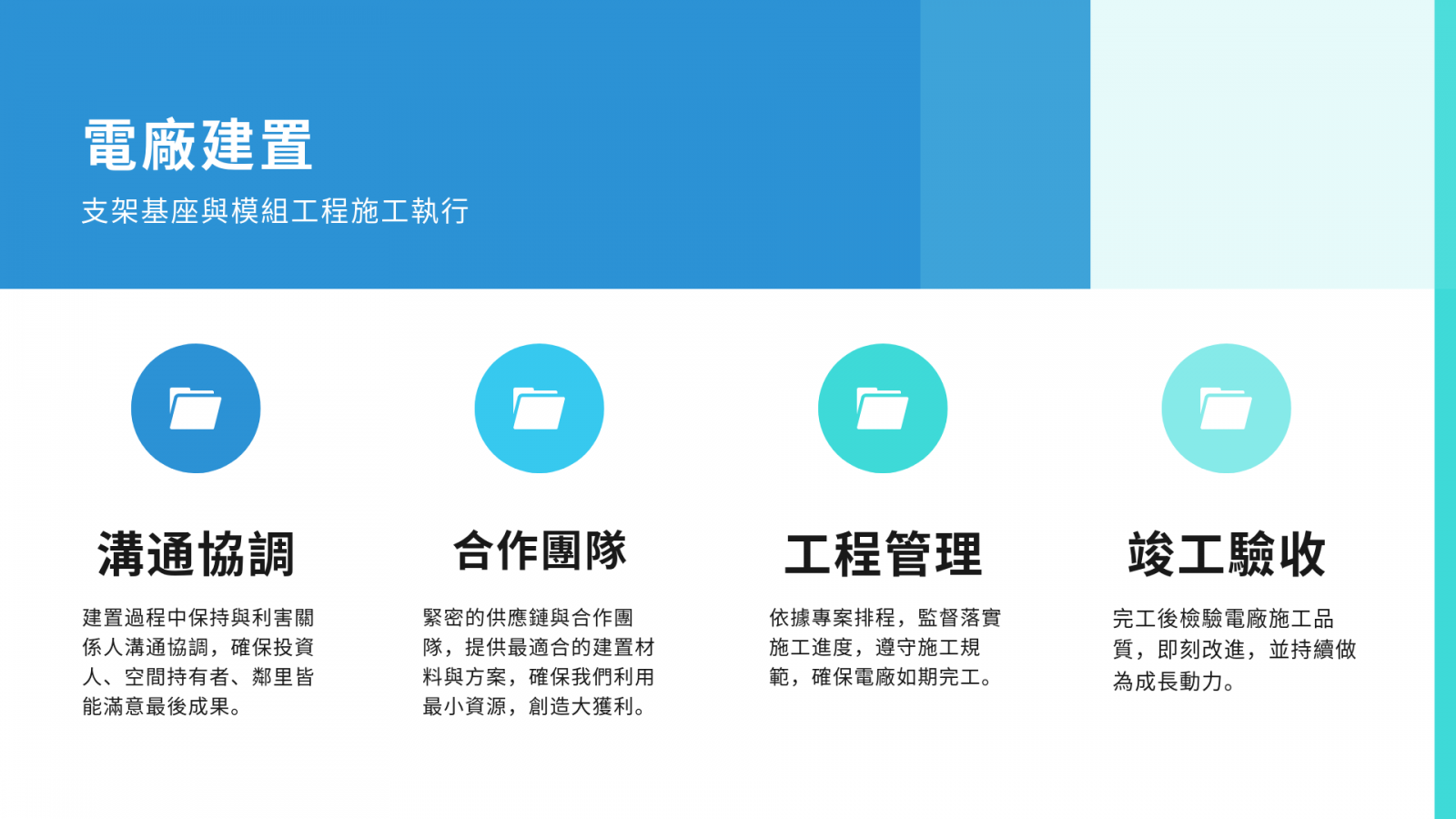 亞電控股重視安全及品質,所以我們訂立了嚴格的工程與材料規範,另外也制定安全衛生管理辦法,安全教育與工程監督絕不馬虎。透過專業的施工與品質控管,提升太陽能系統的防風、防水、結構強度與可靠度,並以嚴格的驗收標準確保工程結構品質完善。